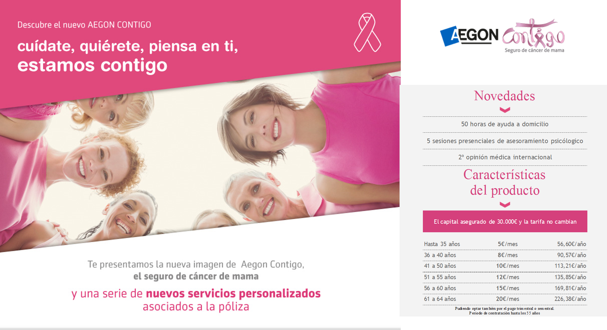 Cuando una situación de este tipo te sorprende, no queda más remedio que enfrentarlo del mejor modo posible, psicológicamente y también económicamente. Es por ello, que Aegón Seguros, consciente de lo duro que resulta afrontar estas situaciones, ha querido contribuir y hacer más llevadero este momento a través de un seguro médico específico para el cáncer de mama, con objeto de que el tema económico no añada más tensión a esos momentos y nos ayude a resolver la situación con el mejor servicio posible y los mejores especialistas.